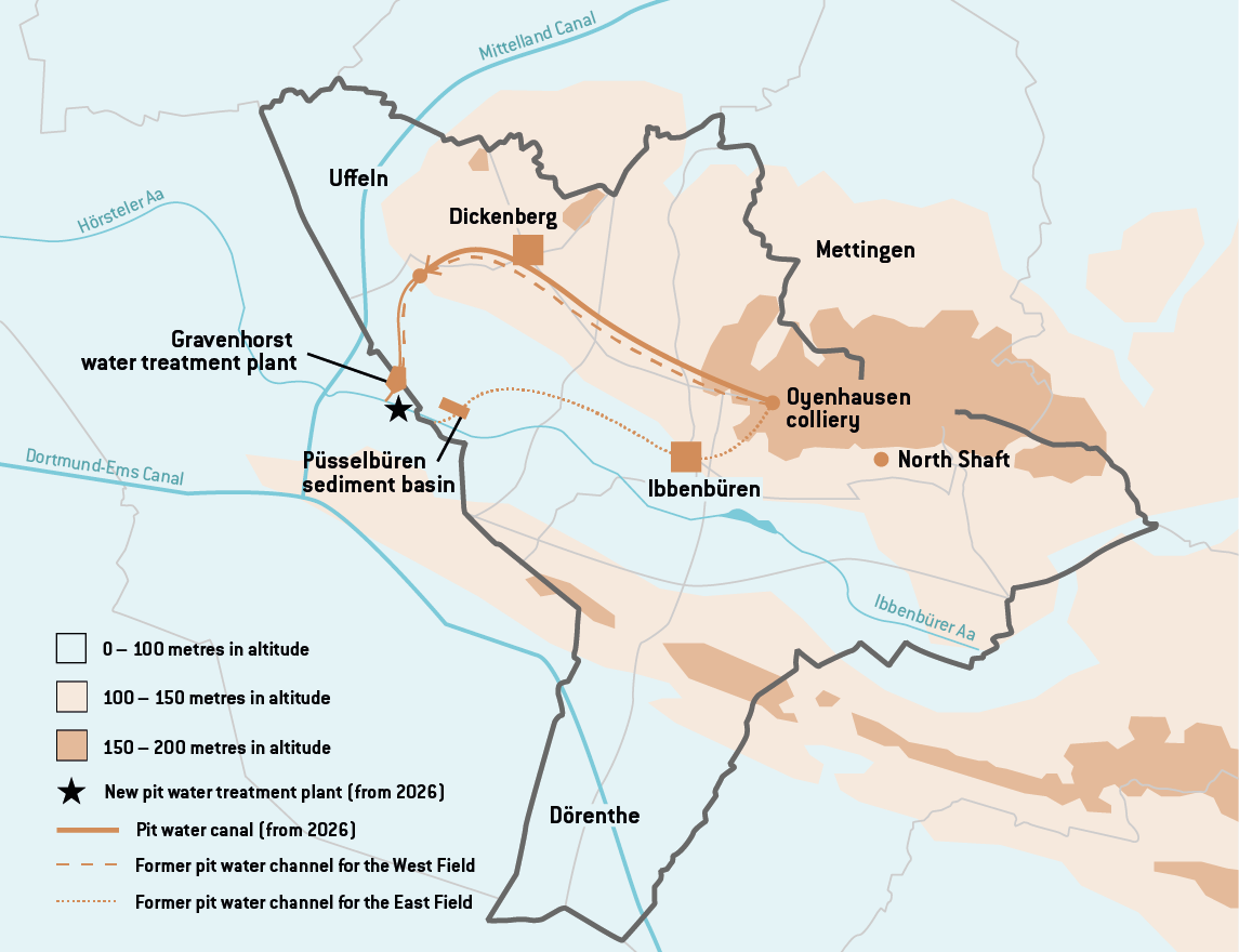 In December 2022, excavation of the approximately 7.4-kilometre canal in Ibbenbüren began at a depth of around 70 metres. By 2026, all pit water from the colliery is to flow without power-intensive pumps through the 3.6 metre-wide canal into the pit water treatment plant in Gravenhorst, which is still under construction. The costs of more than 200 million euros will be financed by the RAG-Stiftung.