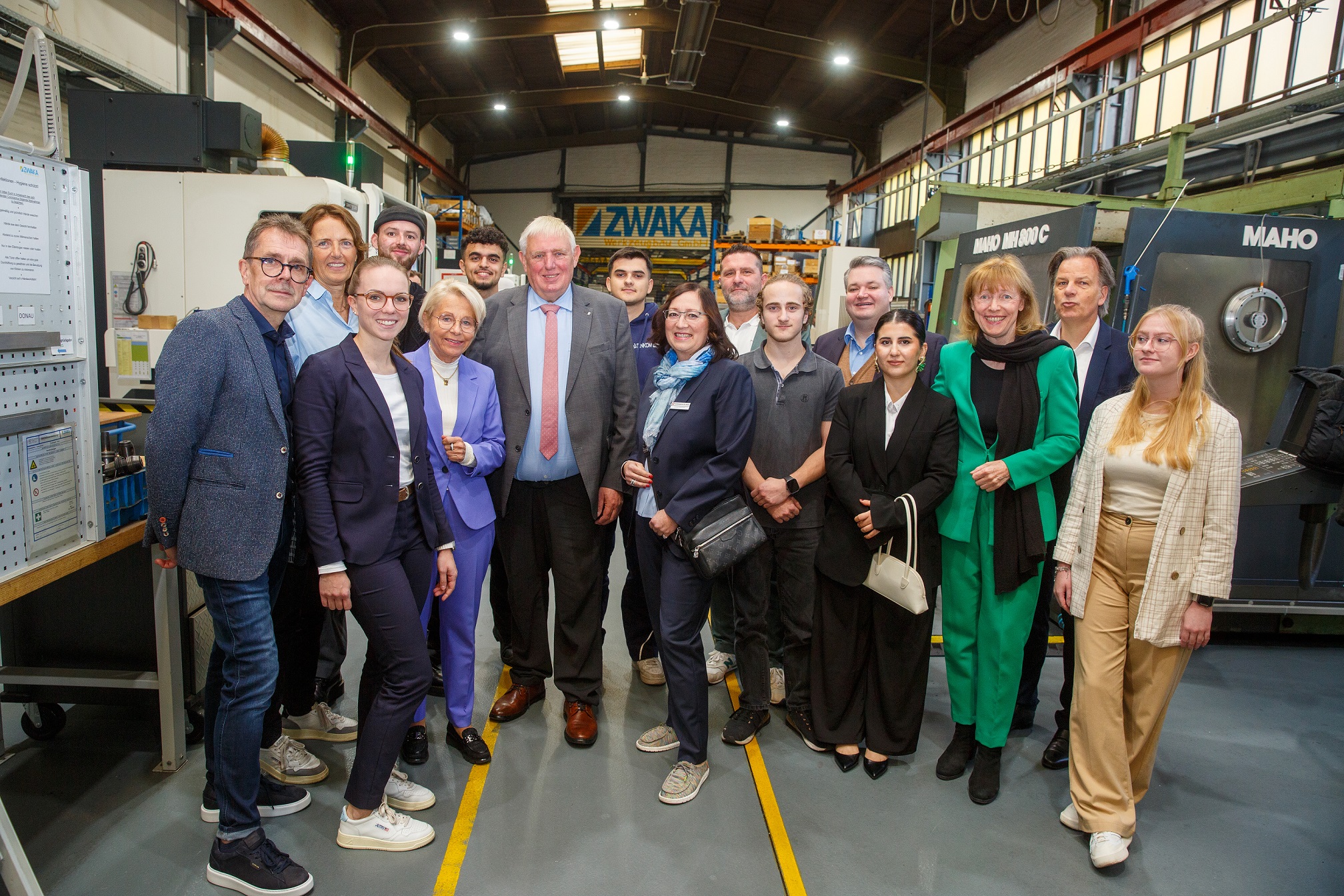 Gelsenkirchen, 23. Oktober 2024. Arbeitsminister Karl-Josef Laumann und Bärbel Bergerhoff-Wodopia, Mitglied im Vorstand der RAG-Stiftung, haben am Mittwoch, 23. Oktober 2024, die Zwaka Werkzeugbau GmbH in Gelsenkirchen besucht. Bereits vier Auszubildende hat der Betrieb mithilfe der Ausbildungsprogramme des Landes gefunden, die die RAG-Stiftung an den ehemaligen Kohlestandorten in Nordrhein-Westfalen bereits seit 2008 finanziell unterstützt. Beim Austausch mit den Betriebsinhabern, Trägervertretungen sowie den Auszubildenden von Zwaka und anderen Betrieben in der Region ging es um Chancen und Möglichkeiten einer Berufsausbildung im Ruhrgebiet und den ehemaligen Bergbaustandorten sowie die konkrete Unterstützung bei der Ausbildungsplatzsuche durch das landesweite Programm „Ausbildungswege NRW”.