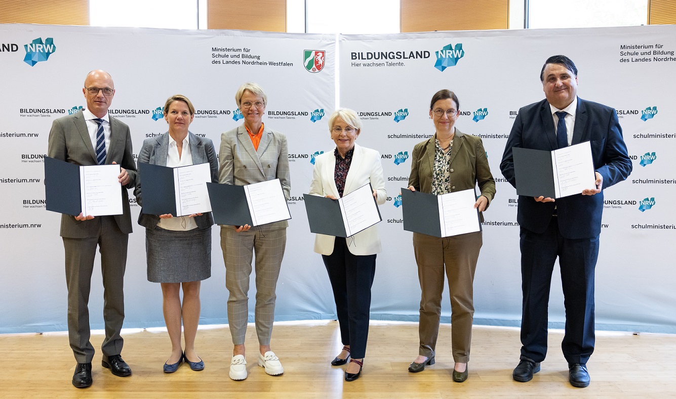 Um ihre Zusammenarbeit zu besiegeln, haben Ministerin Feller, die Vorständin der RAG-Stiftung, Bärbel Bergerhoff-Wodopia, der Geschäftsführer der Wübben Stiftung Bildung, Dr. Markus Warnke, der Rektor der Ruhr-Universität Bochum, Prof. Dr. Martin Paul, die Rektorin der Universität Duisburg-Essen, Prof. Dr. Barbara Albert, und die Prorektorin Studium der Technischen Universität Dortmund, Prof. Wiebke Möhring, heute (12. September) in Düsseldorf einen Letter of Intent unterzeichnet, in dem die Eckpunkte des gemeinsamen Vorhabens abgefasst sind.
