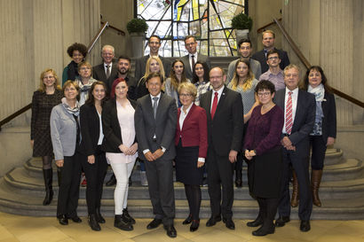 Die Beteiligten des heutigen Pressegesprächs, darunter NRW‐Arbeitsminister Rainer Schmeltzer, RAG‐Vorstandsmitglied Bärbel Bergerhoff‐Wodopia, Hernes Oberbürgermeister Dr. Frank Dudda sowie Vertreter des Programmes in den einzelnen Städten und Teilnehmer machten die gelungene Zusammenarbeit aller Akteure deutlich.