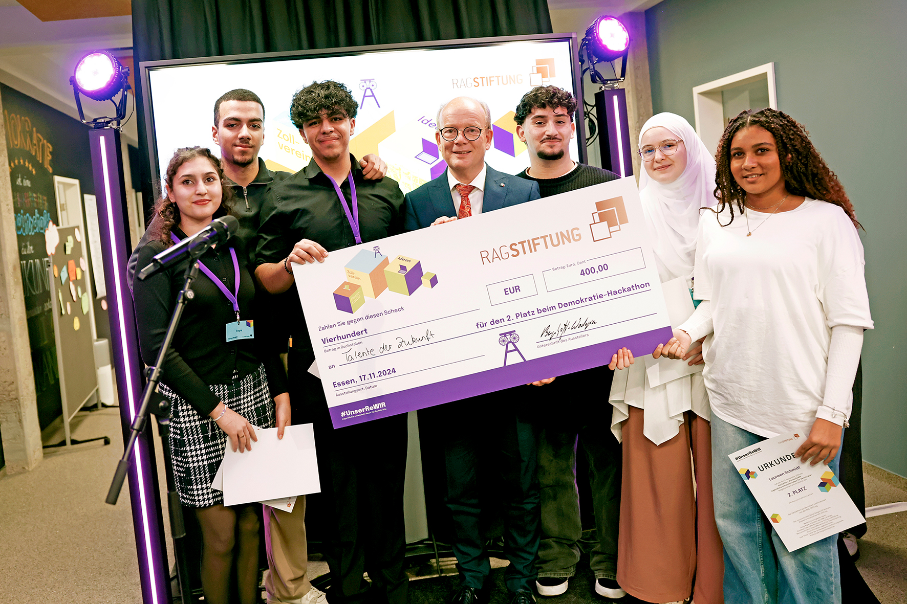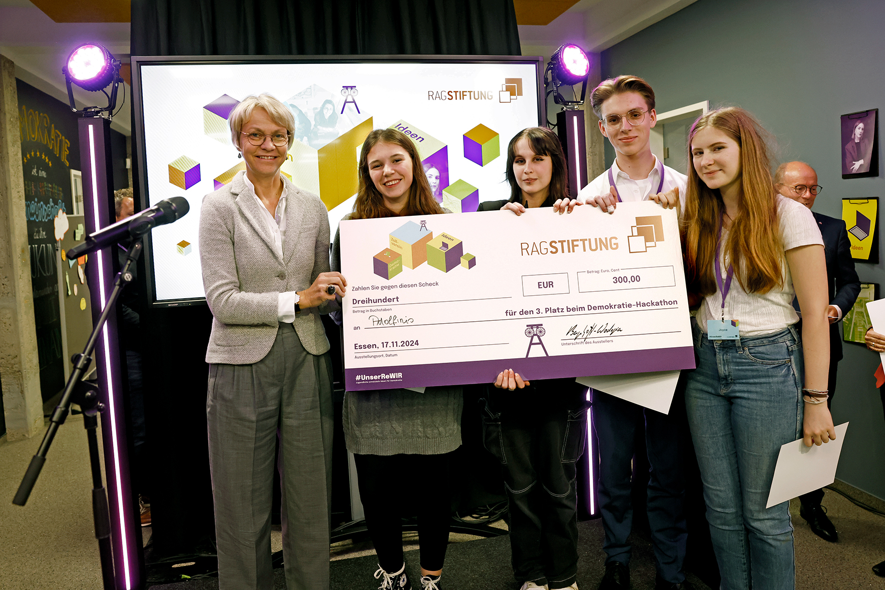 Insgesamt 11 Teams bestehend aus vier bis sechs Teammitgliedern brüteten am vergangenen Samstag und Sonntag vor der beeindruckenden Kulisse der Kokerei Zollverein über der Fragestellung, wie Demokratieförderung gelingen und beispielsweise gegen Hass und Hetze, Antisemitismus oder Fake-News vorgegangen werden kann. Inspiration erhielten die angetretenen Teams dabei durch spannende Kurzvorträge zum Thema Demokratie. Für das leibliche Wohl war ebenso gesorgt wie für kreative Pausen. Die über zwei intensive Tage erarbeiteten Ideen für mehr Demokratie wurden dann am Sonntagnachmittag in jeweils fünfminütigen Präsentationen einer hochkarätig besetzten Jury vorgestellt, moderiert von der Influencerin und Investorin Diana zur Löwen. Am Ende konnte sich jedes Mitglied der drei Siegerteams über ein Preisgeld in Höhe von 500 Euro (1. Preis), 400 Euro (2. Preis) oder 300 Euro (3. Preis) freuen und darauf, dass ihre Ideen nicht nur graue Theorie bleiben, sondern auch zur Umsetzung gebracht werden sollen. Dafür stellt die RAG-Stiftung insgesamt bis zu 150.000 Euro bereit. Aber auch alle weiteren Teilnehmerinnen und Teilnehmer, die mit ihrer Idee keinen der ersten drei Plätze belegen konnten, durften sich als Gewinner fühlen. Sie erhielten für ihren Einsatz beim Hackathon neben viel Lob zusätzlich 100 Euro.