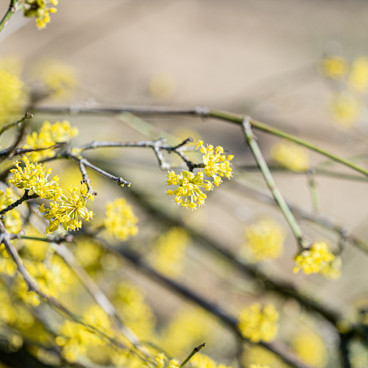 Anders als es der Name vermuten ließe, ist die Kornelkirsche, die im Volksmund auch Herlitze genannt wird, nicht mit Süß- oder Sauerkirschen verwandt, wenngleich ihre Früchte nicht giftig sind, sondern jede Menge wichtige Vitamine enthalten. Die Kornelkirsche zählt zu den härtesten Holzarten Europas. Das Holz ist so schwer, dass es im Wasser untergeht. Dieser Eigenschaft verdankt der Baum das „mas“ im botanischen Namen, was männlich bedeutet. Ihre kleinen, gelben, Dolden kommen schon ab Februar zum Vorschein, weshalb sie insbesondere für Bienen, aber auch für andere Insekten ein wichtiges Nährgehölz ist.